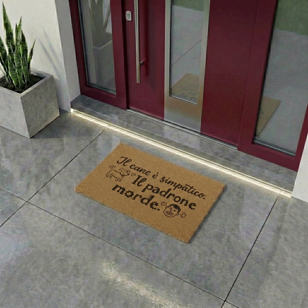 Dimentica i soliti cartelli di pericolo. Qui la vera minaccia cammina su due gambe. Questo Zerbino della Verità ribalta completamente le aspettative di chi suona il campanello: "Il cane è simpatico. Il padrone morde."