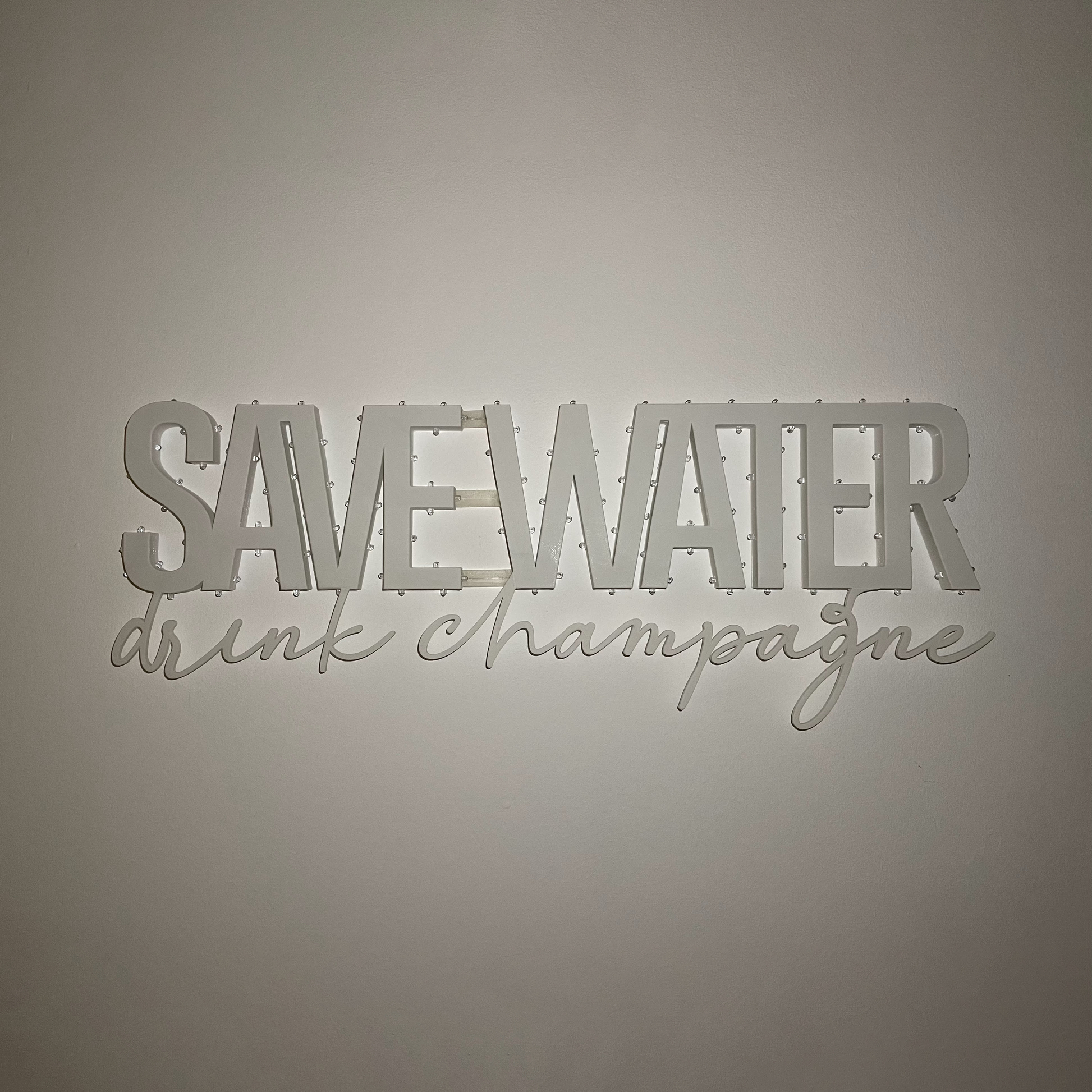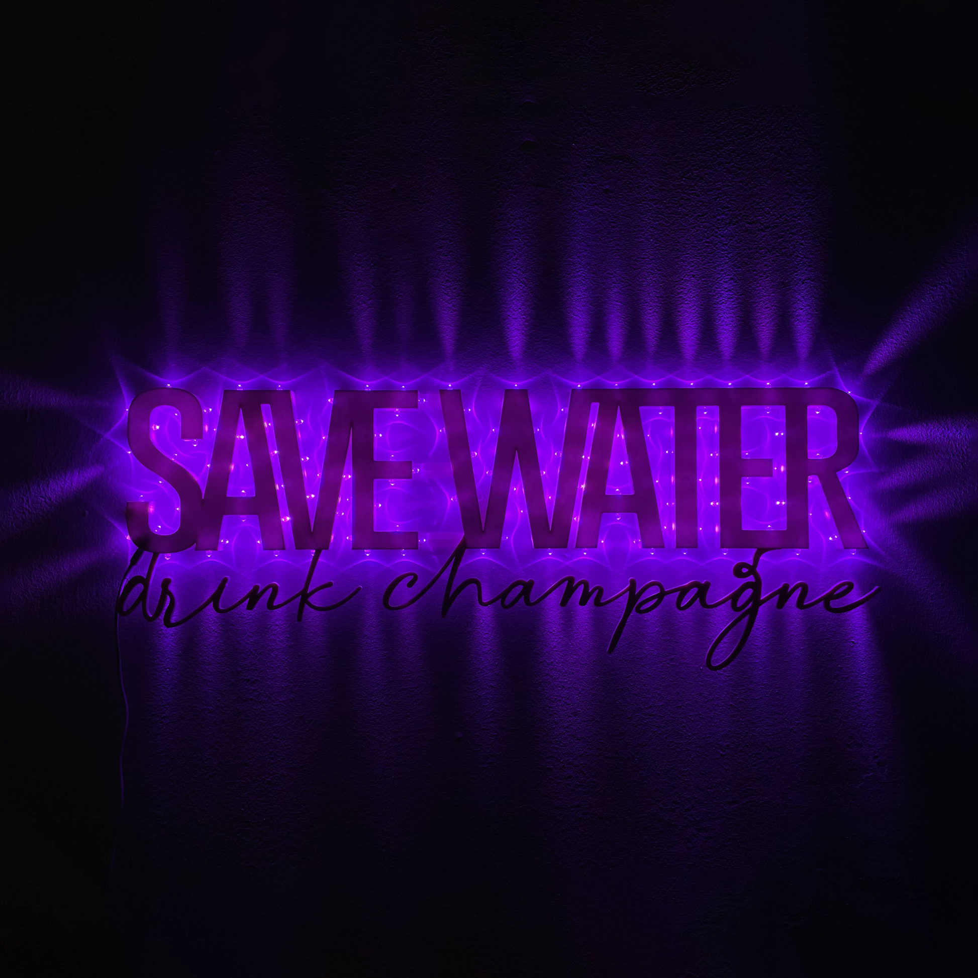 Luminaria d'arredo in PLA+ stampata in 3D. Scritta SAVE WATER drink champagne con LED da 5 millimetri ed interfaccia di alimentazione USB type-C a presa. La luminaria è stampata in 3D in Acido Polilattico successivamente lavorato restituendo un effetto finale simil legno.