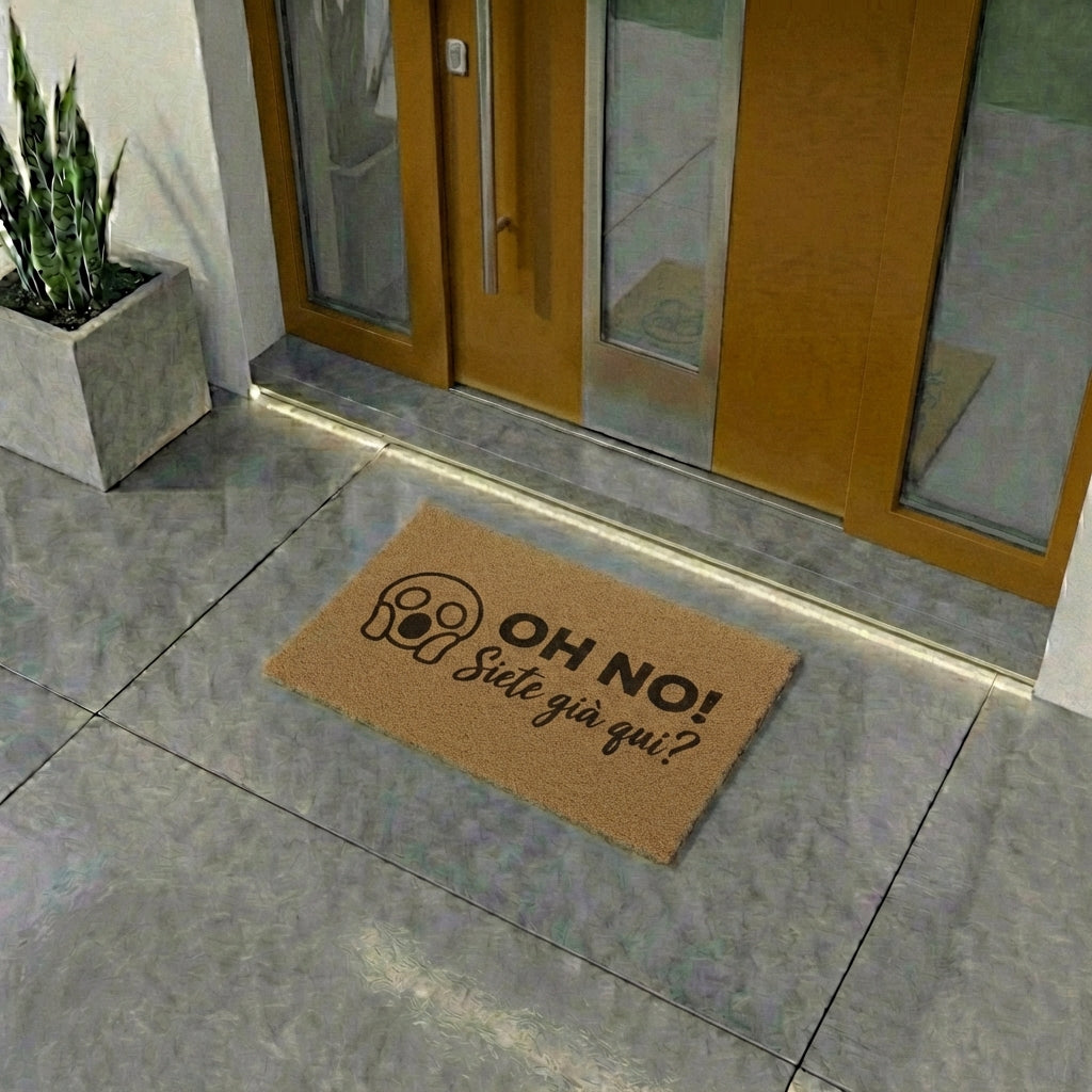 Hai presente quel momento di puro terrore quando suona il campanello e tu sei ancora in accappatoio, con i capelli bagnati e la casa che sembra un campo di battaglia? Questo Zerbino della Verità dà voce al tuo pensiero esatto in quel preciso istante: "Oh no! Siete già qui?"